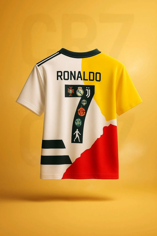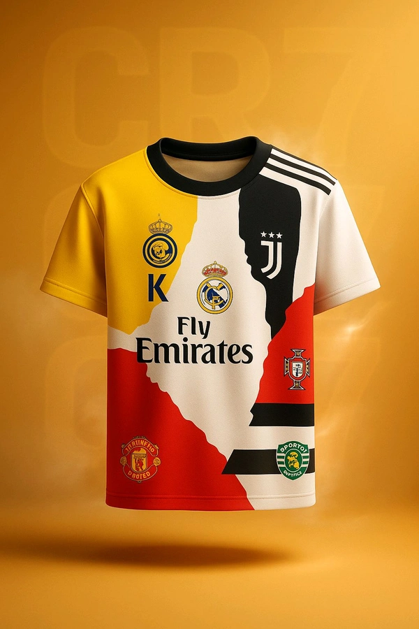 ๐ All Clubs, One Jersey โ Featuring iconic logos of all the clubs CR7 has played for โ Sporting CP, Manchester United, Real Madrid, Juventus, Al-Nassr, and Portugal National Team โ blended into a bold and dynamic design.